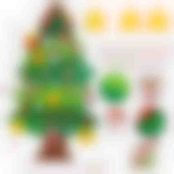Изработени от същия плътен, висококачествен филц. Прикрепят се с пришити велкро лепенки (за разлика от по-евтините лепени). Примери включват камбанки, подаръци, снежен човек, бонбони и снежинки. Елхата има звезда за върха и ствол за основата. Велкрото е зашито върху елхата, за да държи двете части стабилно.