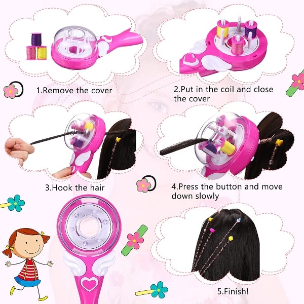 Съдържание на пакета: 1 x Ръководство за плетене на Whizzbraid, 12 x щипки за коса, 3 x конеца (жълти, розови и лилави конци), 2 x аксесоари за улесняване на употребата